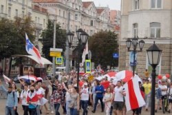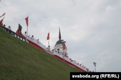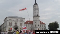 Прамоўцаў перарываюць воклічы: «Не даруем!», «Жыве Беларусь!», «Ганьба!». Іншыя ўдзельнікі маршу фатаграфуюцца зь бел-чырвона-белымі сьцягамі на фоне ратушы. Утварылі ланцуг ля парапэтаў на Замкавай гары. Цяпер калёна зноў рухаецца ў бок плошчы Леніна, гукаючы традыцыйныя для пратэстаў споклічы.