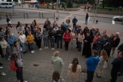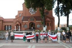 Да людзей, якія выстраіліся ў ланцуг салідарнасьці перад касьцёлам, падыходзілі супрацоўнікі АМАПу і казалі, што мерапрыемства несанкцыянаванае.