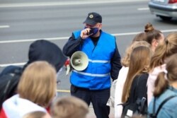 15:26 Сілавікі спрабуюць заблякаваць праход па вуліцы Няміга ад Катэдральнага сабору ў бок Раманаўскай слабады. Студэнты перабягаюць цераз дарогу на другі бок.