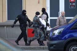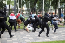 12:07 Каля галоўнага корпусу БДУ людзі ў чорным і ў вайсковай форме затрымалі і зьбівалі людзей.