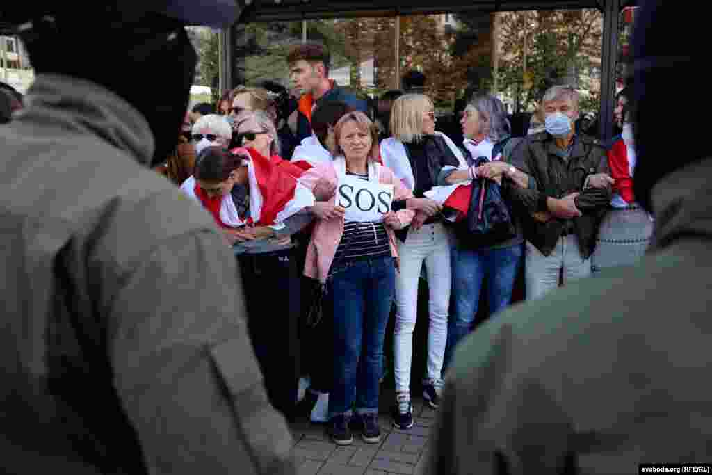 Сталая жанчына падайшла да людзей, якіх акружыў АМАП, і стала ў першы шэраг