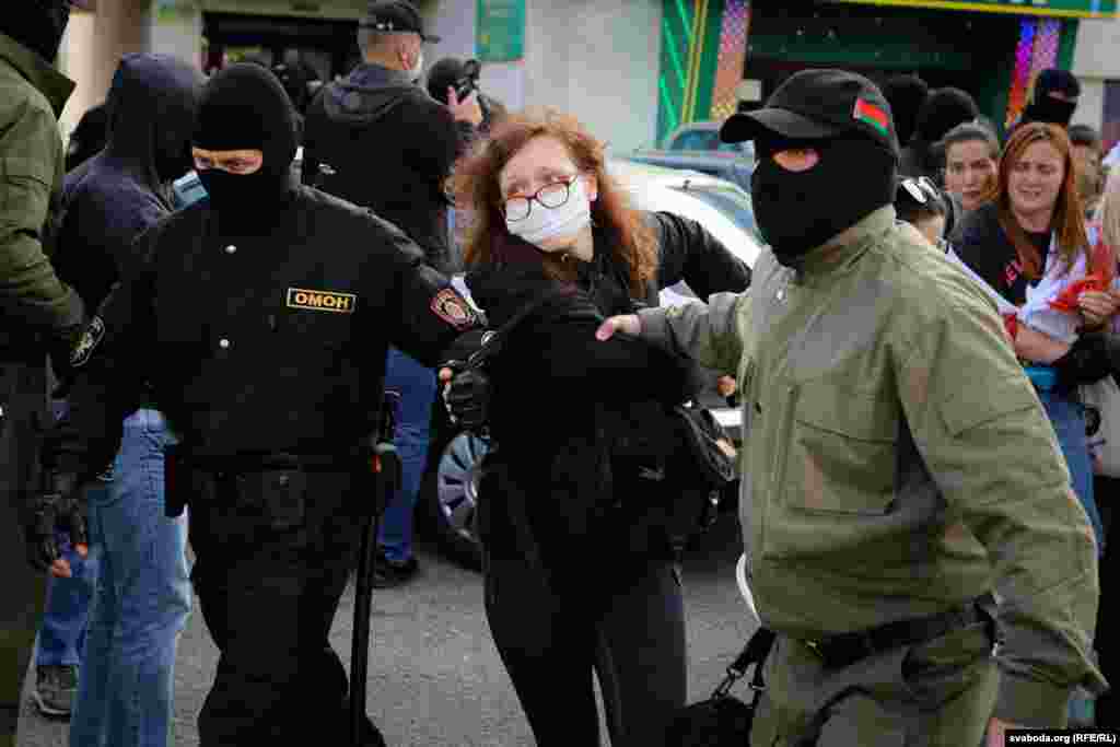 Сярод першых затрымалі 73-гадовую Ніну Багінскую, сымбаль мірнага пратэсту ў Беларусі. Пазьней яе адпусьцілі каля РУУС