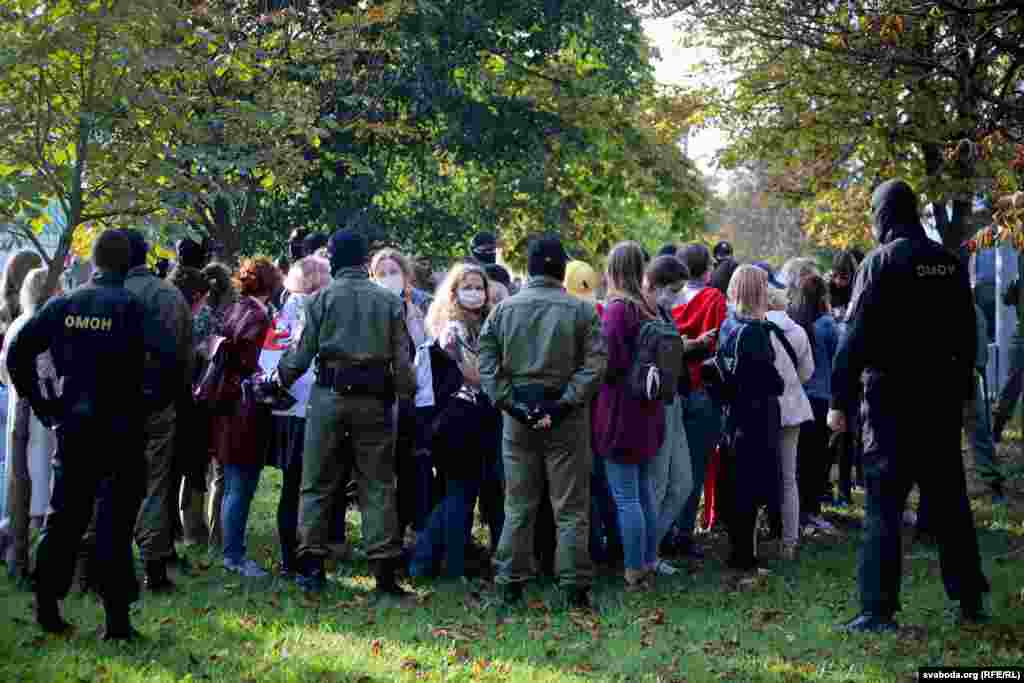 Каля забаўляльнага цэнтру «Айсбэрг» на скрыжаваньні Сурганава і Якуба Коласа сілавікі ў балаклавах разьбілі калёну жанчын на некалькі частак, абкружылі ўдзельніц