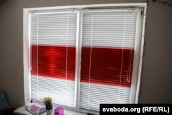 Паказаў Сяргей і вокны, дзе звонку былі бел-чырвона-белыя жалюзі. Дарэчы, тыя вокны глядзелі на сосны — жылых дамоў насупраць няма. Цяпер звонку жалюзі белыя, чырвоная сярэдзіна заклеена малюнкамі дзяцей з хрысьціянскай сымболікай.