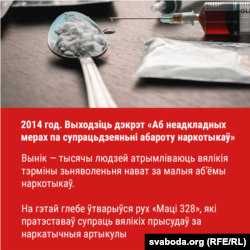 У сьнежні 2014 году Лукашэнка падпісаў дэкрэт «Аб неадкладных мерах па супрацьдзеяньні абароту наркотыкаў». Дакумэнт прадугледжваў шэраг захадаў, якія б спрыялі барацьбе з наркотыкамі.