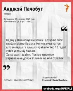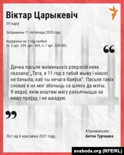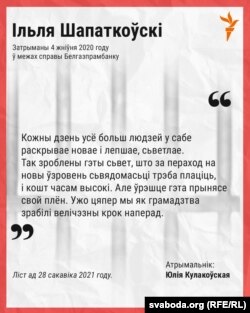 Калі вы лістуецеся зь вязьнямі і хочаце падзяліцца натхняльнымі фрагмэнтамі зь іхных лістоў, пішыце на radiosvaboda at gmail.com або ў нашыя сацыяльныя сеткі з пазнакай «Цытаты праз краты».