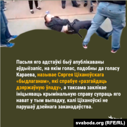 Праз два месяцы пасьля адстаўкі Караева ініцыятыва ByPol апублікавала аўдыёзапіс, зроблены, меркавана, на адным са сходаў супрацоўнікаў МУС. На ім голас, падобны да голасу былога кіраўніка ведамства, называе Сяргея Ціханоўскага «быдлаганам», які спрабуе «разгайдаць дзяржаўную ўладу», а таксама заклікае ініцыяваць крымінальную справу супраць яго нават у тым выпадку, калі Ціханоўскі не парушаў дзейнага заканадаўства.