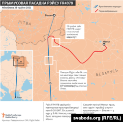 - беларускія авіядыспэтчары заявілі лётнаму экіпажу, што яны атрымалі «рэальную пагрозу таго, што калі самалёт увойдзе ў паветраную прастору Літвы ці паспрабуе прызямліцца ў аэрапорце Вільні, на борце выбухне бомба»;