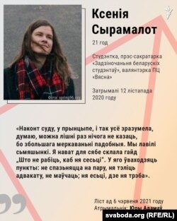 - Студэнтка, прэс-сакратарка «Задзіночаньня беларускіх студэнтаў», валянтэрка ПЦ «Вясна»