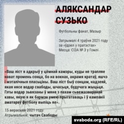 «Стараюся займаць сябе па максымуму, захоўваючы розум і цела. Вялікая падмога ў гэтым — лісты ад жонкі, ад знаёмых і незнаёмых людзей, як зь Беларусі, так і з-за яе межаў. Гэта дапамагае мне адчуваць сябе ня кінутым, не забытым, адчуваць адзінства і падтрымку».