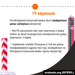 Польскія і беларускія памежнікі адначасова паведамілі аб тым, што на мяжы былі знойдзеныя целы загінулых мігрантаў. Агенцтва БелТА расказала пра труп жанчыны з Іраку, побач зь якой знаходзіліся непаўналетнія дзеці, мужчына і старая. Памежная служба Польшчы ў той жа дзень паінфармавала адразу пра тры знойдзеныя на беларуска-польскай мяжы трупы мігрантаў. Падрабязнасьцяў расьсьледаваньня інцыдэнтаў няма.