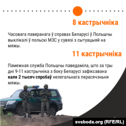 - 8 кастрычніка Варшава заявіла, што трактуе паводзіны беларускага боку як «агрэсіўныя дзеяньні супраць Польшчы». Зьявіўся шэраг відэадоказаў, што беларускія памежнікі ня толькі не спыняюць мігрантаў, але і актыўна дапамагаюць ім нелегальна перасякаць польскую мяжу.
