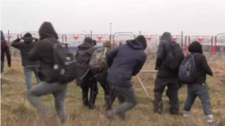 Некалькі мігрантаў падыйшлі да беларускіх сілавікоў са шчытамі і заяўляюць, што хочуць вярнуцца ў Менск, каб адтуль ляцець назад у Азію.