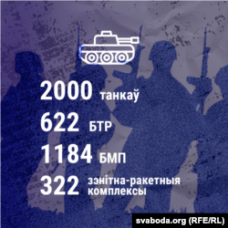 - 1184 баявыя машыны пяхоты (клясы БМП-1, БМП-2, БМП-3, БТР-3, БТР-4)