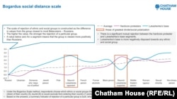 У лістападаўскім 2021 году апытаньні Chatham House задавалася пытаньне пра стаўленьне рэспандэнтаў да розных грамадзкіх групаў — этнічных, сацыяльных, палітычных. З дапамогай так званай шкалы сацыяльнай дыстанцыі Багардуса вымяралася, настолькі блізкія, прымальныя для апытаных прадстаўнікі тых ці іншых групаў.