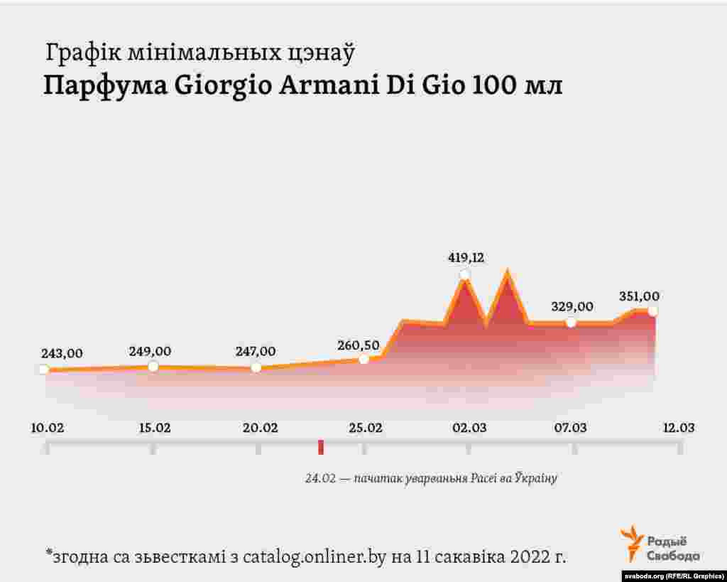 Напад Расеі на Ўкраіну адазваўся рэзкім выбухам цэнаў на ўсе тавары ў Беларусі, асабліва замежнай вытворчасьці. Па ўсім відаць, што гэта яшчэ не канчатковыя цэны, бо даляр не спыняе свайго росту. На графіках вы можаце пабачыць мінімальную цану кожнага з тавараў у залежнасьці ад даты.