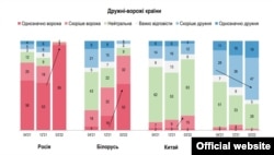 Паводле апытаньня «Рэйтынгу», у сакавіку толькі дзьве краіны большасьць украінцаў лічылі варожымі да іхнае краіны — гэта Беларусь і Расея. Расею лічылі варожай краінай амаль усе пагалоўна, Беларусь — менш, але таксама пераважная большасьць. Зьвяртае на сябе ўвагу, што ацэнкі варожасьці Беларусі імкліва павялічваліся за некалькі апошніх месяцаў. У сьнежні летась вайны яшчэ не было, расейскія войскі ў Беларусь яшчэ не прыехалі, двухбаковы гандаль разьвіваўся даволі інтэнсіўна. Аднак ужо тады амаль кожны другі ўкраінец лічыў Беларусь у той ці іншай ступені варожай Украіне.
