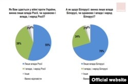 Украінцы адрозьніваюць Беларусь і Расею ў сэнсе суадносінаў адказнасьці за вайну ўлады і народу. Адносна Беларусі яны ўскладаюць адказнасьць пераважна на Лукашэнку, толькі прыкладна чвэрць — і на яго, і на беларускі народ. Аднак пры гэтым, адказваючы на папярэдняе пытаньне, украінцы называюць варожай не беларускую (ці антыбеларускую) ўладу, а краіну Беларусь.