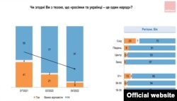 Летась Уладзімір Пуцін апублікаваў артыкул, у якім абгрунтоўваў, што расейцы і ўкраінцы — адзін народ. Тую ж тэзу ён паўтарыў у сваім выступе 21 лютага сёлета аб прызнаньні незалежнасьці «ДНР» і «ЛНР». Летась немалая частка ўкраінцаў гэтую тэзу падзяляла, хоць, магчыма, і зь іншай, чым у Пуціна, інтэрпрэтацыяй. Але пасьля пачатку вайны доля прыхільнікаў такога ўяўленьня скарацілася ў 5 разоў.