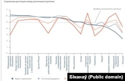 На графіку відаць, што палітычныя антыподы — зацятыя праціўнікі і зацятыя прыхільнікі ўлады — ставяцца адны да адных горш, чым да каго б там ні было іншага. Іх узаемныя ацэнкі — паміж 6 і 7, гэта значыць паміж «гатовыя прыняць як турыста ў Беларусі» і «ні ў якім выглядзе не хацеў бы бачыць іх у Беларусі».