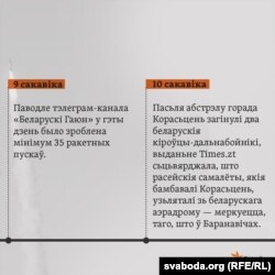 Акрамя таго, за больш як 150 дзён паўнамаштабнай вайны розныя крыніцы, у тым ліку ўкраінскія тэлеграм-каналы, распаўсюджвалі іншую інфармацыю пра абстрэлы ўкраінскай тэрыторыі зь беларускага боку, але шэраг зьвестак не атрымалі пацьверджаньня або абстрэлы вяліся расейцамі зь іншых пазыцый.