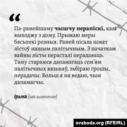 «Я застаюся ў Беларусі. Па-ранейшаму чышчу перапіскі, калі выходжу з дому. Прымаю меры бясьпекі розныя. Раней пісала шмат лістоў нашым палітычным. З пачаткам вайны лісты перасталі перадаваць. Таму стараюся дапамагаць сем’ям палітычных вязьняў, зьбіраю грошы, перадачы. Больш я ня ведаю, чым дапамагчы. Яшчэ дапамагалі ўкраінскім уцекачам, перадавалі прадукты ва ўкраінскія памежныя вёскі, калі гэта было магчыма, вясной. Калі пачалася вайна, па нашым горадзе паехалі калёны тэхнікі, танкі, паляцелі над галавой самалёты — эмацыйнае жаданьне было зьехаць. У мяне быў проста жудасны стан. Але ў мяне маці старая, сын у школе вучыцца. Я адказная за іх», — кажа Ірына.