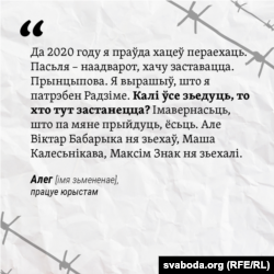 «Да 2020 году я праўда хацеў пераехаць. Пасьля — наадварот, хачу заставацца. Прынцыпова. Я вырашыў, што я патрэбен Радзіме. Калі ўсе зьедуць, то хто тут застанецца? Імавернасьць, што па мяне прыйдуць, ёсьць. Але Віктар Бабарыка ня зьехаў, Маша Калесьнікава, Максім Знак ня зьехалі. У Бабарыкі нашмат больш, чым у мяне, было магчымасьцяў выехаць і нармальна жыць. Мяне, у прынцыпе, нічога не трымае. Я магу сабрацца за пяць хвілін і паехаць. Але я веру ў непазьбежнасьць перамен. Ведаеце, калі ты стаіш на скале і яна дрыжыць, табе здаецца, што вось-вось нешта адбудзецца, — вось такое ў мяне адчуваньне цяпер», — кажа Алег.