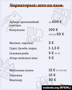 «Для Чарнагорыі было неўласьціва, што хтосьці да іх едзе на сталае жыхарства. Раней у несэзон цэны былі невысокія. У сакавіку кватэру можна было знайсьці за 400–500 эўра. У летні пэрыяд будуць прапаноўваць за 800–1000 на месяц. Мы ў траўні знайшлі кватэру зь дзьвюма спальнямі і гасьцёўняй за 450 эўра. Нам пашанцавала, хутчэй нармальная прапанова — гэта 600. Ёсьць свая спэцыфіка: у летнія месяцы мы будзем плаціць тысячу эўра, а ў астатнія месяцы каля 250, у сярэднім будзе выходзіць 450. Людзі баяцца, што прабудзем лета і зьедзем, а яны прайграюць», — кажа мастачка.