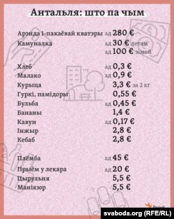 «Гэта невялікая кватэра з мэбляй, халадзільнікам. Каб вы разумелі, то мінімальны заробак у Турэччыне 5250 лір. Антальля — вялікі горад, але там самыя розныя раёны. Каля мора будзе каштаваць даражэй, але ў іншым кірунку кватэры ня дужа дарагія. У Антальлі цяпер шмат беларусаў жыве — айцішнікі, псыхолягі. Ведаю, што некаторыя наймаюць сабе пакойчык у бутык-гатэлях — гэта выходзіць таньней. І прыбяруцца, і камуналку плаціць ня трэба».