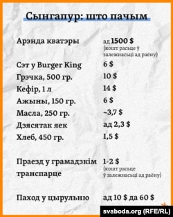 Па яе назіраньнях, дарагія ў Сынгапуры грэчка, бульба, садавіна, ягады. Невысокія ж цэны на мясцовыя прадукты. Напрыклад, на рыс у шматлікіх варыяцыях.