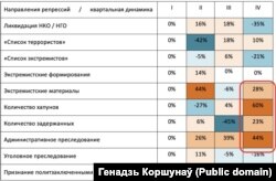 — Генадзь, вы раз на квартал робіце справаздачу пра дынаміку палітычных рэпрэсіяў у Беларусі. У вашых справаздачах фігуруе шмат паказьнікаў інтэнсіўнасьці рэпрэсіяў (колькасьць палітвязьняў, штрафаў, адміністрацыйных арыштаў, экстрэмісцкіх фармаваньняў і матэрыялаў, асобаў, датычных да тэрарызму, ліквідаваных НДА і г.д.) Якія зь лічбаў, на ваш погляд, самыя важныя? Наколькі іх дынаміка сынхронная?