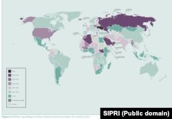 У дасьледаваньні SIPRI прадстаўленая мапа сьвету, на якой пазначаныя рознымі колерамі памеры вайсковых выдаткаў як долі ВУП.