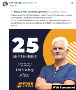 «Сёньня спаўняецца 63 гады ляўрэату Нобэлеўскай прэміі міру, заснавальніку праваабарончага цэнтру „Вясна“, палітвязьню Алесю Бяляцкаму. Гэта ўжо пяты ягоны дзень народзінаў за кратамі, дзе ён нядаўна перанёс апэрацыю. Вельмі важна дамагчыся вызваленьня Алеся і ўсіх 1200+ палітвязьняў у Беларусі...», — гаварылася ў допісе НАУ.
