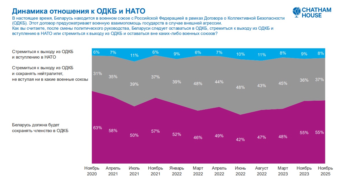 — Паводле вынікаў апытаньня гараджанаў Беларусі больш за палову апытаных (55%) выказаліся за захаваньне сяброўства краіны ў АДКБ і пасьля зьмены палітычнага кіраўніцтва Беларусі, 8% — за ўступленьне Беларусі ў NATO, 37% — за выхад з АДКБ і захаваньне нэўтралітэту. Графік цікавы ў рэчышчы палітычных спрэчак у дэмакратычных сілах пра геапалітычны выбар. Адны — за эўрапейскі выбар, іншыя — за нэўтралітэт, за «беларускую Фінляндыю». Гэты графік — больш пераканаўчы аргумэнт на чыю карысьць? Ці можна спадзявацца, што настроі могуць кардынальна зьмяніцца: сёньня за NATO 8%, а заўтра мо і 60%?