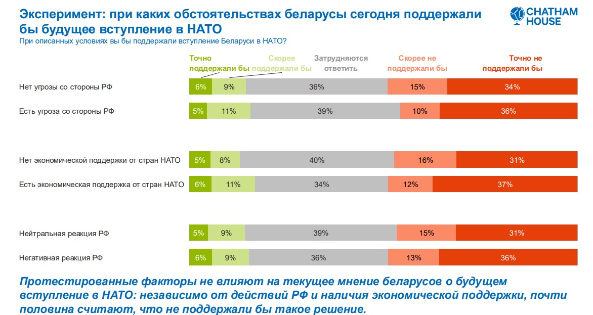 — Вы ў апытаньні таксама задалі шэраг пражэктыўных пытаньняў — ці варта Беларусі ўступіць у NATO пры розных умовах (ёсьць эканамічная падтрымка з боку Захаду ці няма, Расея супраць Беларусі ў NATO ці ня супраць). І дзіўна, што гэтыя ўмовы ніяк не ўплывалі на выбар. Пра што гэта сьведчыць?