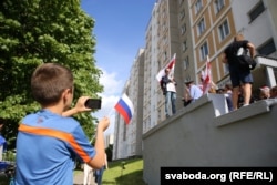 «Не саюзу з бандай», «Пуцін — забойца», «Расея гэта вайна», — такія лёзунгі былі на плякатах пікетоўцаў і прагучалі каля дому нумар 32 на Магілёўскай вуліцы.