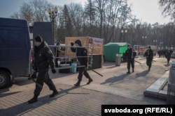 Праваахоўнікі затрымалі тых, хто спрабаваў пранесьці на плошчу бел-чырвона-белыя сьцягі, «для высьвятленьня асобы». Падобна, затрымліваюць таксама выпадковых мінакоў.