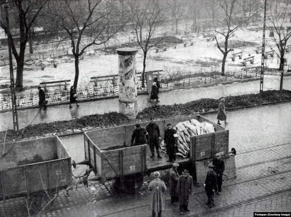Вышэйпрыведзенае фота, зробленае з Будайскай крэпасьці, зьяўляецца адным з сотняў здымкаў, што захоўваюцца ў вугорскім архіве Fortepan, на якіх адлюстраваныя маштабы разбурэньня Будапэшту пасьля 13 лютага 1945 г. У той дзень страляніна змоўкла пасьля сямі тыдняў разбурэньня, якое стане вядомым як аблога Будапэшту.