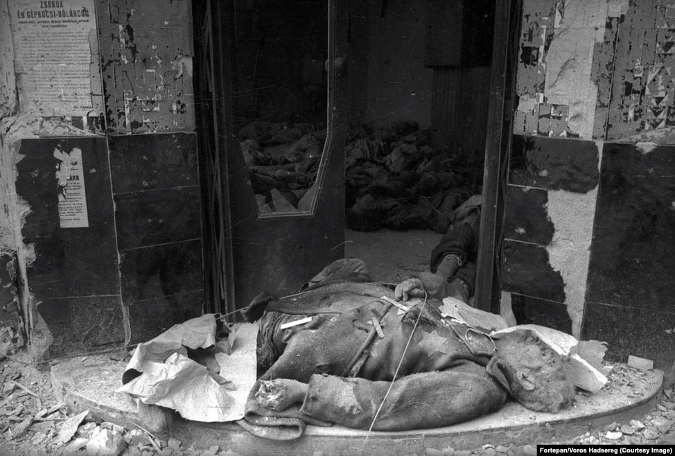 Вугорскі ваенны фатограф Робэрт Капа прыбыў у Будапэшт пасьля блякады. Ён апісаў свой родны горад як «прыгожую жанчыну з выбітымі зубамі».