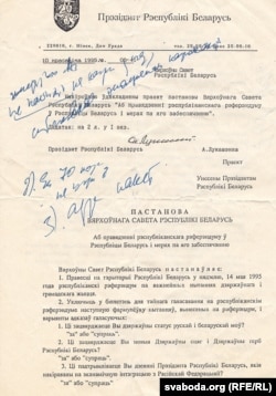 Лукашэнка мяняў фармулёўкі; напрыклад, пытаньне пра мову гучала так: «Ці зацьвярджаеце Вы дзяржаўны статус рускай і беларускай моў?». І калі нехта лічыў патрэбным захаваць статус толькі беларускай мовы — ён быў абавязаны галасаваць і за статус расейскай. Калі ж ён выступаў супраць статусу расейскай — ён, такім чынам, выкрэсьліваў і дзяржаўны статус беларускай мовы.