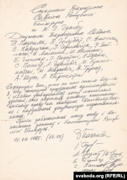 Мы, дэпутаты Апазыцыі Беларускага Народнага Фронту, пратэстуем супраць зьдзекаў над нашым народам, над нашай Айчынай, над вашай Канстытуцыяй і законамі Рэспублікі Беларусь. Вычарпаўшы ўсе магчымасьці, у знак пратэсту супраць антызаконнасьці і згубнасьці вашых дзеяньняў мы аб’яўляем галадоўку тут, у цэнтры гэтай залі. Пачынаем яе цяпер, з гэтай хвіліны. Мы патрабуем выкананьня Канстытуцыі, законаў Рэспублікі Беларусь, свабоды слова і ліквідацыі цэнзуры... (Шум у зале)... спыніць рабаваньне народа і Бацькаўшчыны! (Шум у зале), Шаноўная Інэса Міхайлаўна! Вы — міністар аховы здароўя. Прашу Вас прыслаць урача і зафіксаваць пачатак галадоўкі. (Шум у зале). Прадаўжайце, спадары дэпутаты, сэсію».