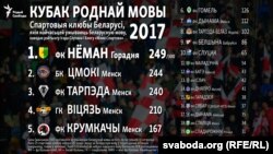 Што праўда, трэнд ідзе ў асноўным па футболе, а акрамя футбольных радуюць хіба гандбольны клюб „Віцязь“, які ў мінулым рэйтынгу не набраў ніводнага балу, а ў гэтым годзе на чацьвёртым месцы, баскетбольныя „Цмокі“, міні-футбольная „Сталіца“, у нейкім выглядзе хакейнае „Дынама“. Хакей, на жаль, самая небеларускамоўная галіна, хоць кажуць, нібы гэта самы нацыянальны від спорту».