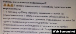 «У сувязі з Днём Волі тыя, хто жыве ў інтэрнатах, абавязкова павінны ісьці туды і нікуды не выходзіць, а менчукі застаюцца ў навучальных карпусах да 16.00. Тлумачаць, што гэта „суботнік“, які доўжыцца 4,5 гадзіны пры зачыненых дзьвярах корпусу. Заявы „ў сувязі з адʼездам да бабулі“, „па сямейных абставінах“ не прымаюцца».
