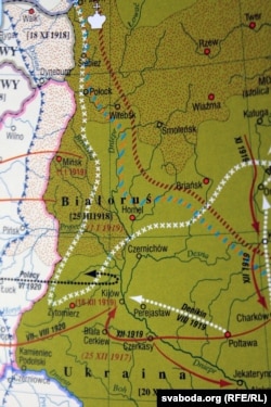 Разгортваем расейскі атляс, па якім вучаць гісторыю школьнікі Расейскай Фэдэрацыі. На адпаведнай мапе, на якой адлюстраваныя падзеі 1918–1922 гадоў, — згадка пра БССР і пра Літоўска-Беларускую ССР, якая праіснавала некалькі месяцаў. Пра БНР — ні слова.