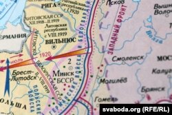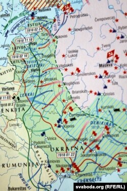 Атляс, па якім вучаць гісторыю літоўскія школьнікі. Адзначаны дакладныя даты абвяшчэньня новых дзяржаў на руінах колішняй Расейскай імпэрыі ў 1918 годзе — Польшчы, Эстоніі, Латвіі, Літвы, Украіны — усіх, апроч Беларусі.