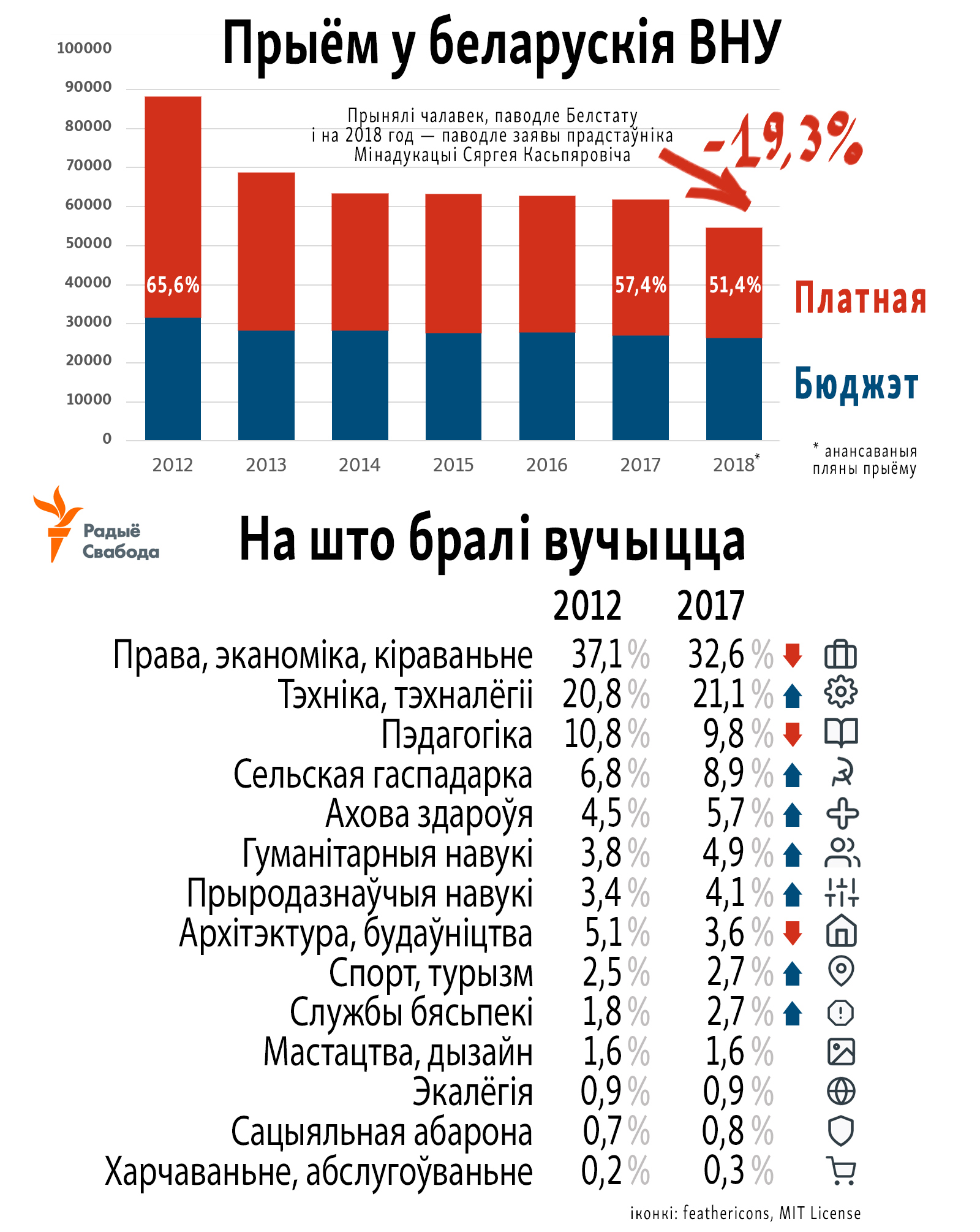 Але асноўнае зьмяншэньне набору адбываецца за кошт платных месцаў. Летась набіралі 61,8 тысячы студэнтаў, цяпер плянуецца набраць толькі 54,5 тысячы. На бюджэтную форму аплаты плянуюць прыняць каля 26,5 тысячы студэнтаў (папярэднія пяць гадоў колькасьць бюджэтнікаў паступова зьніжалася з 31,7 тысячы ў 2012 годзе, 28,3 тысячы ў 2013-м), але на платную форму набор скароціцца амаль на 20% — такое рэзкае зьмяншэньне было ў 2012 годзе. Калі ў тым 2012-м «платнікаў» было 65,6% ад усіх набраных студэнтаў, цяпер мае быць толькі 51,4%.