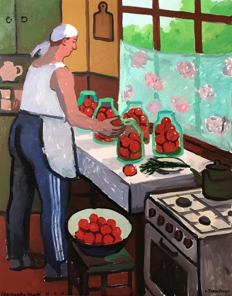 Марынаваньне памідораў. Дзядуля мастачкі быў дырэктарам прадуктовай крамы, таму ў яе доме, верагодна, бываў нават «дэфіцыт».