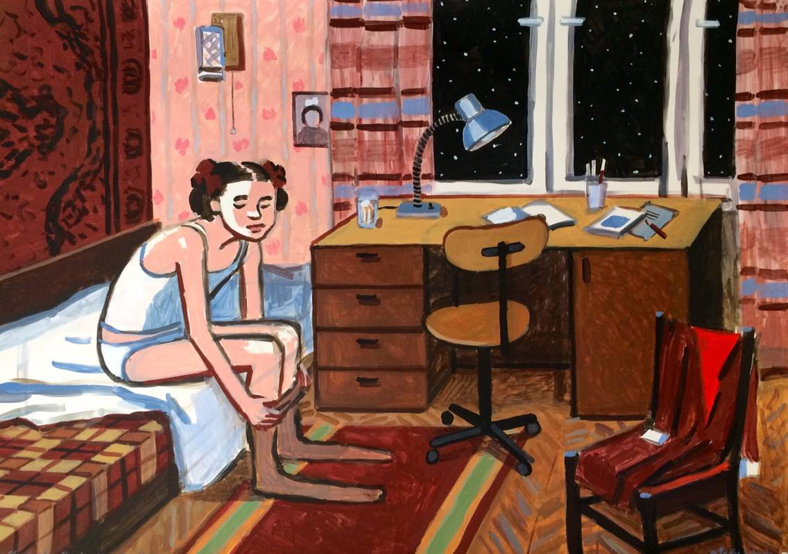 Лецішча ва ўкраінскай вёсцы. «Апошнія два месяцы [цяжарнасьці], я проста ляжала і малявала па памяці. Напэўна, таму гэтыя работы атрымаліся такімі цёплымі », - кажа тэль-авіўская мастачка.