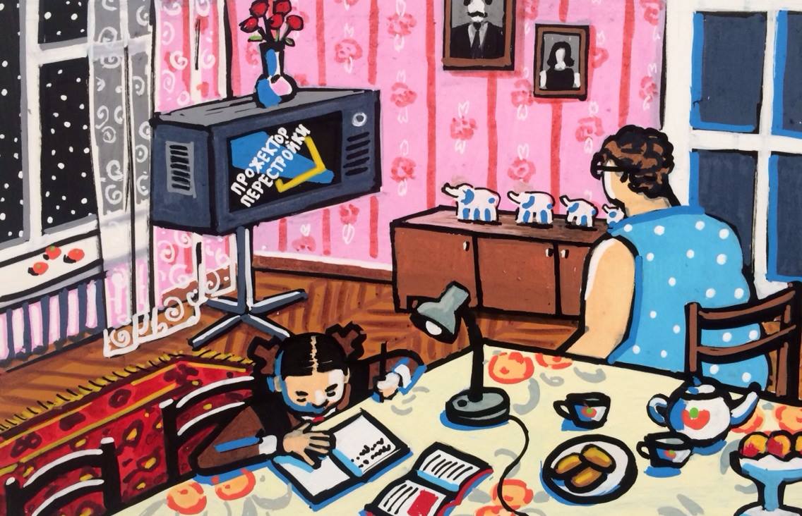 Школьніца робіць ўрокі, а мама глядзіць «Пражэктар перабудовы» - інфармацыйную праграму канца 80-х, у якой распавядалася пра карупцыю ў савецкай сыстэме.