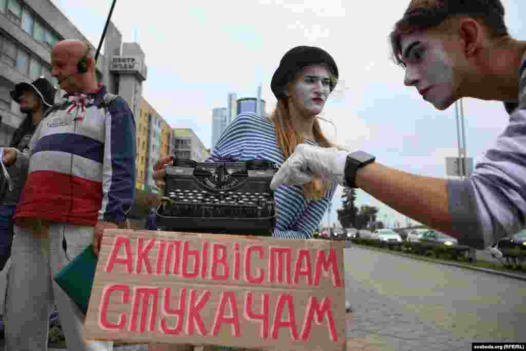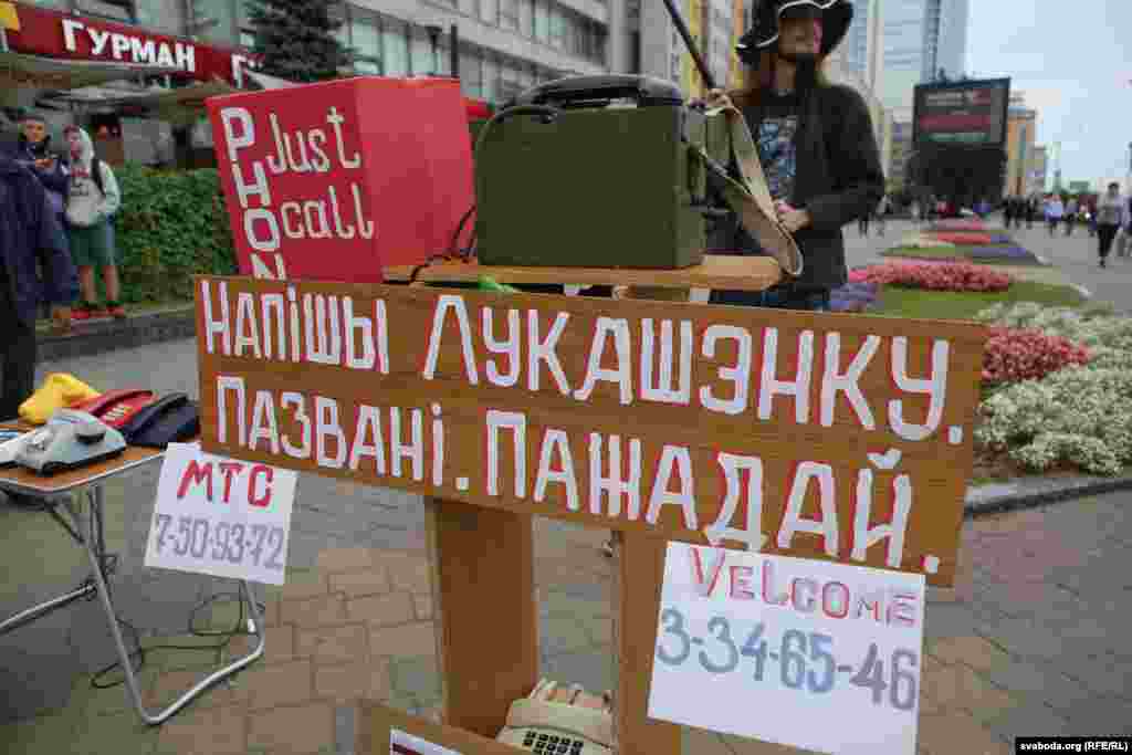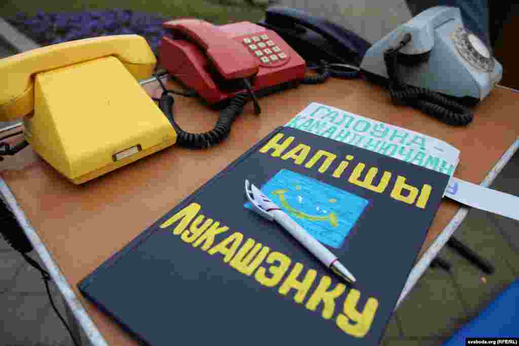Побач з плякатам «Напішы Лукашэнку. Пазвані. Пажадай» на століку — старыя тэлефонныя апараты: вайсковы, дыскавыя, кнопачныя. Унізе — вельмі старая друкарка з таблічкай: «Актывістам-стукачам». Тут жа каробка ад піцы з надпісам: «Месца спыненага часу. Падарунак Лукашэнку для яго дзетак і ўнукаў».